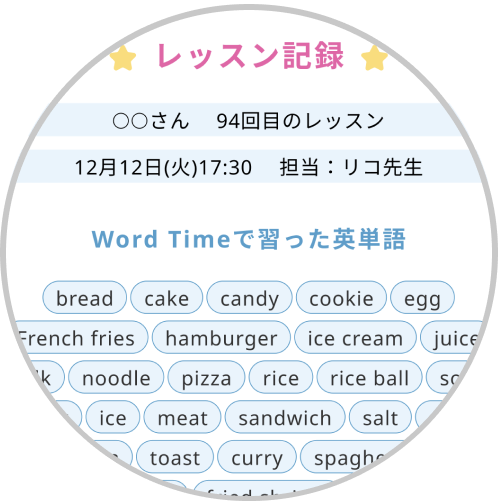 レッスン中に習ったワードやフレーズ、使用したイラストに加え、先生がお子さまに聞いたお話・様子、先生からのメッセージ、宿題などが毎レッスンごとに届きます。レッスンの進捗の確認やお子さまのと会話にご活用いただけます。