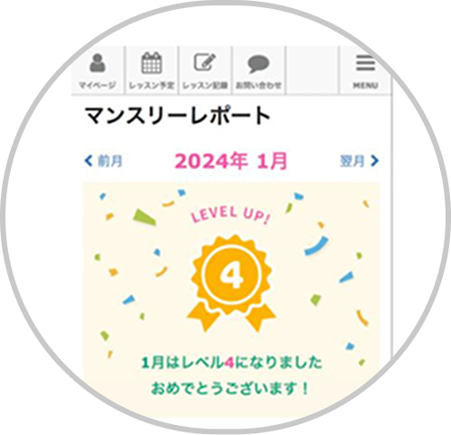 毎月のレッスンや自習コンテンツの利用状況を分かりやすくまとめてお送りします。毎月の振り返りを通してご家庭でお子さまを褒める会話のきっかけとしていただくことで、モチベーション向上に繋げることができます。
